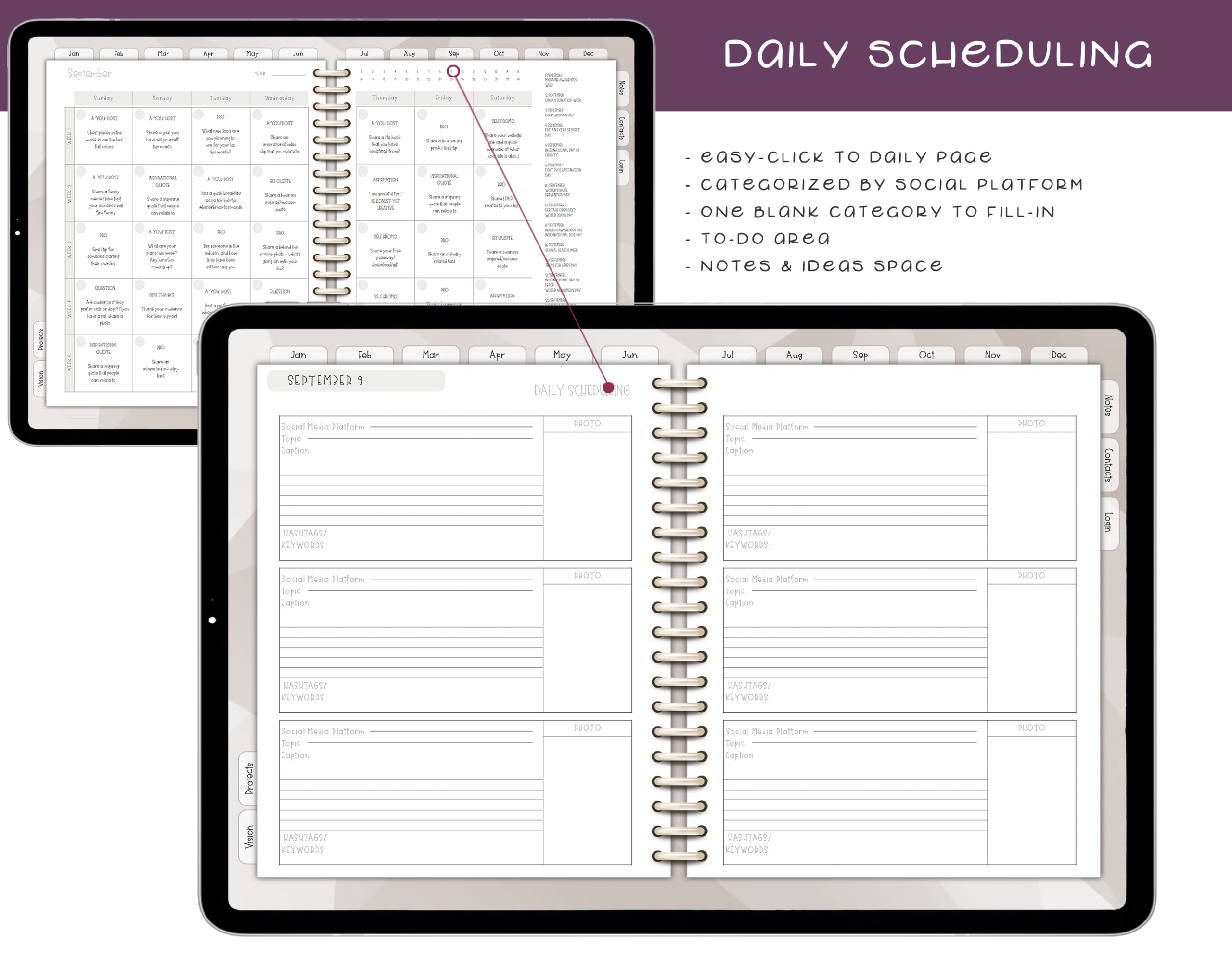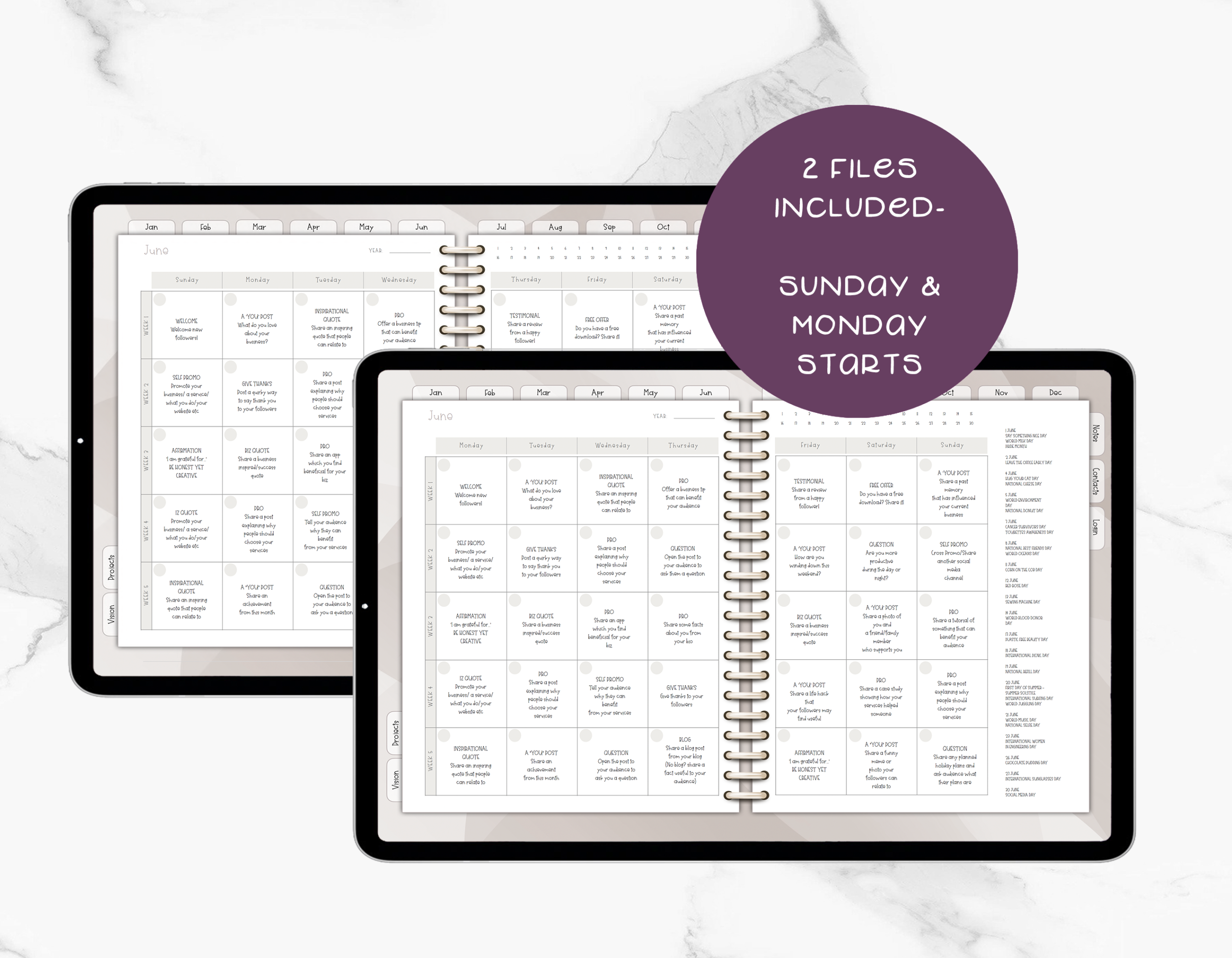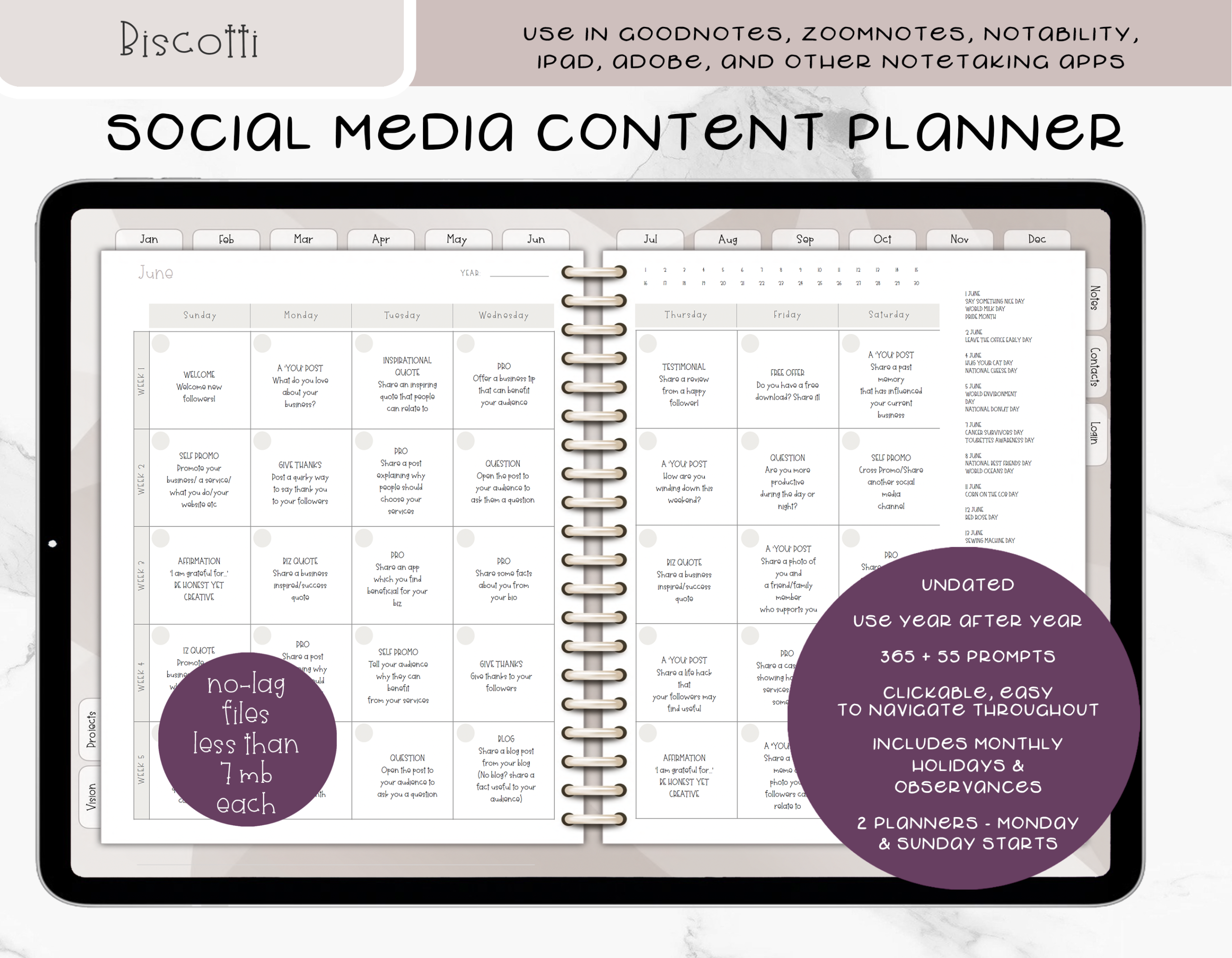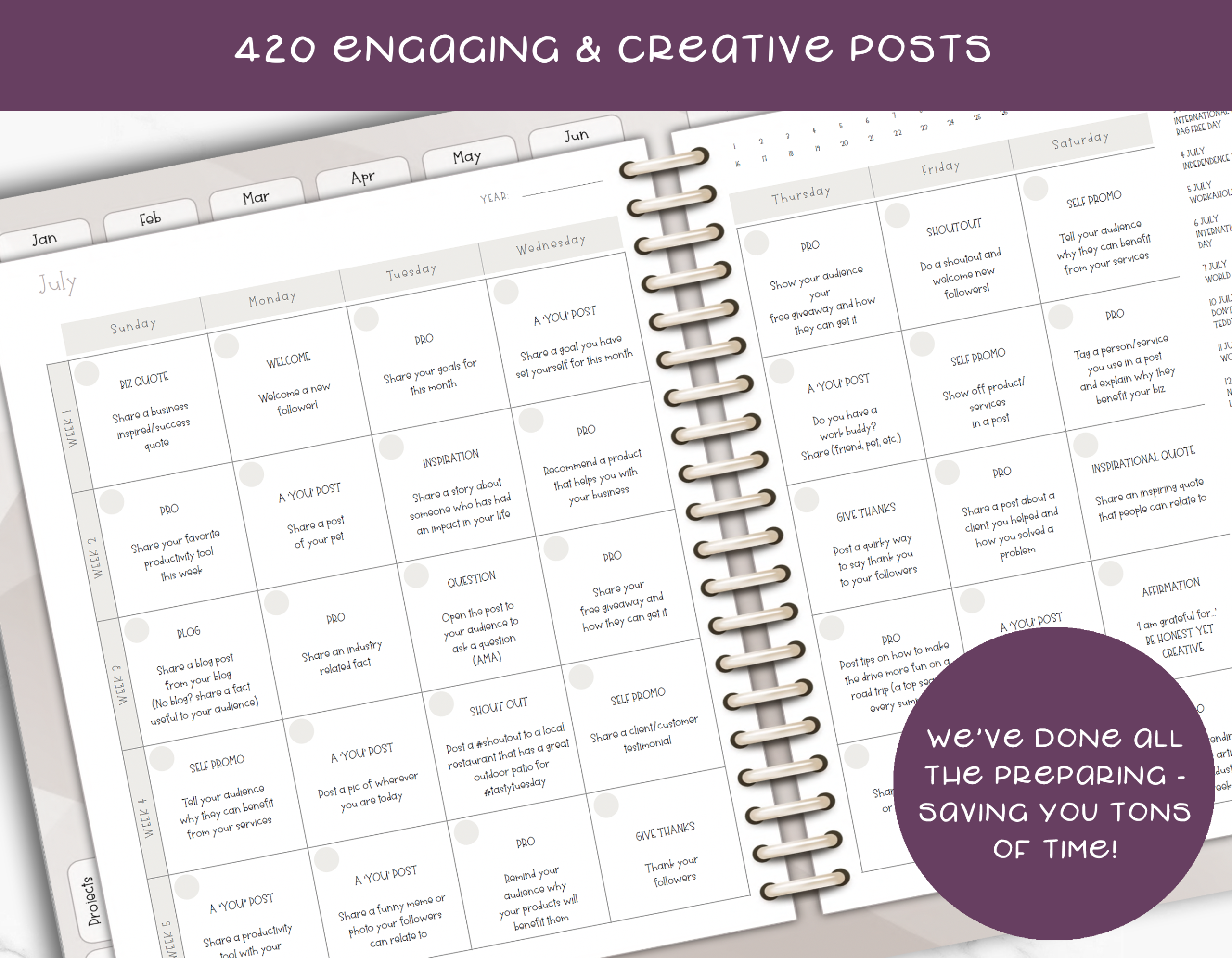Social media calendar – easily organize posts and promote your brand for any online platform. A social media calendar with 420 post prompts helps save time and remove the guesswork from content creation. With the hassle removed, you can relax knowing that the guesswork of what to post is done. Plus, this means more time available for other important tasks related to growing your business or personal brand.