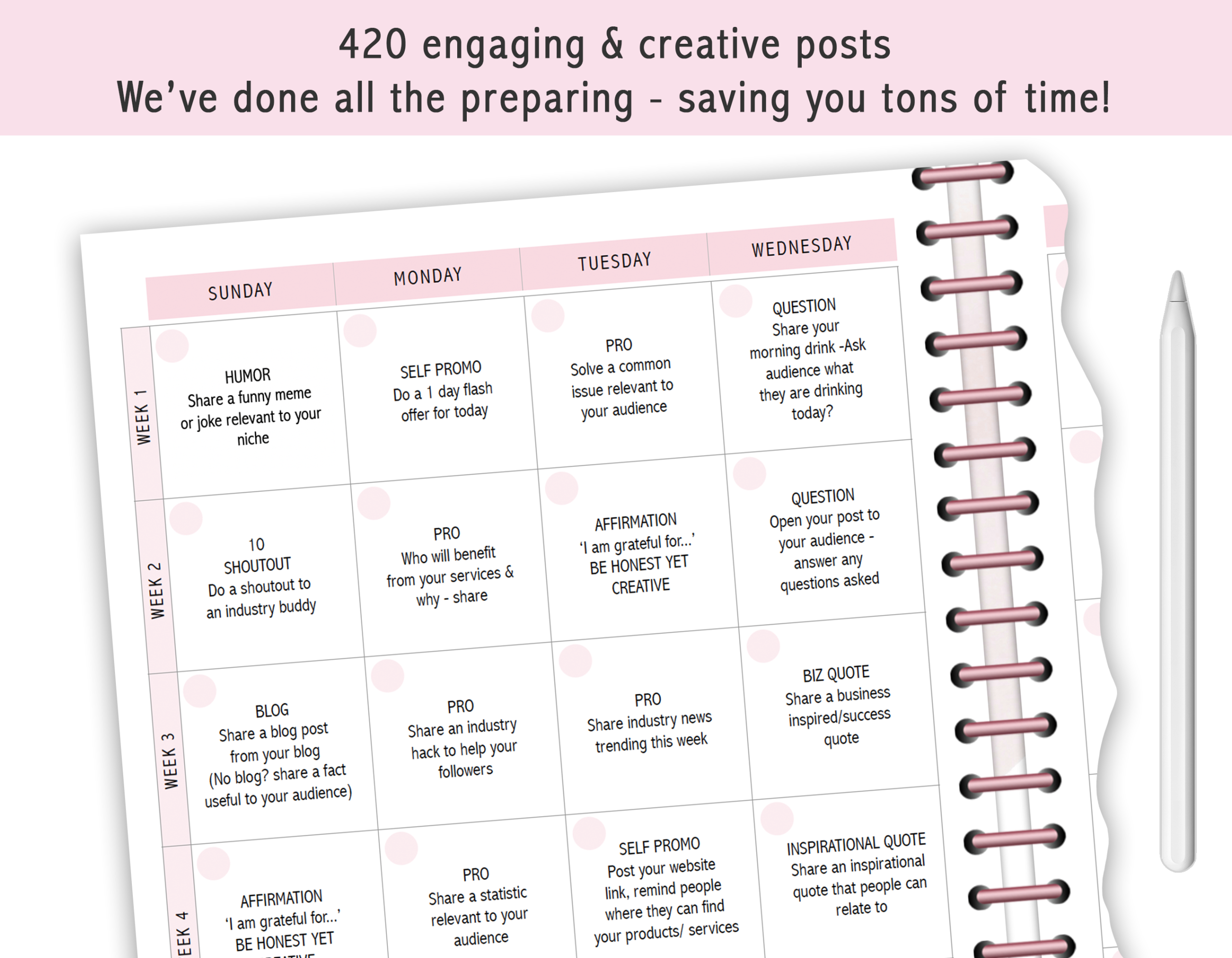 - 420 days of intuitive and engaging social media post topics