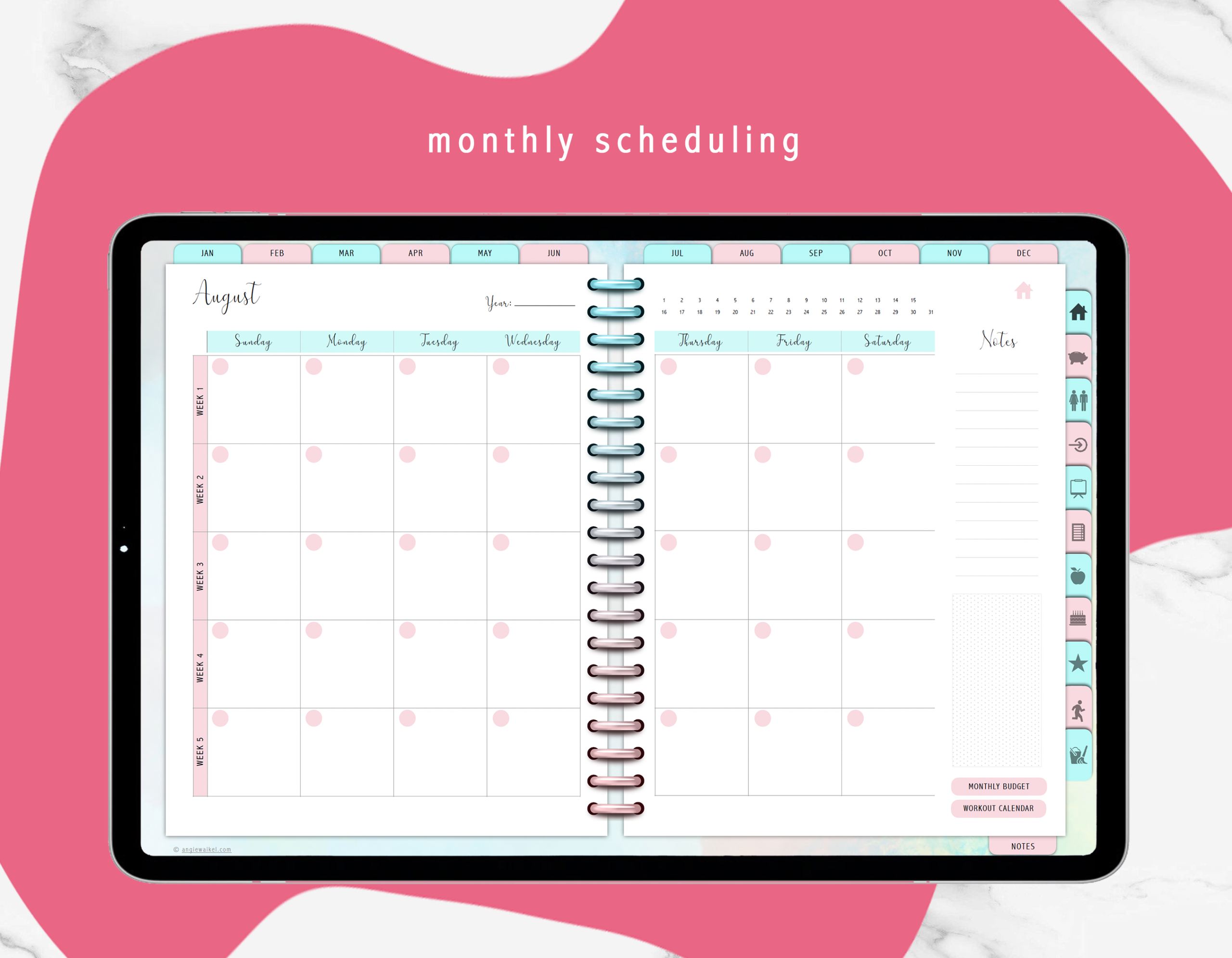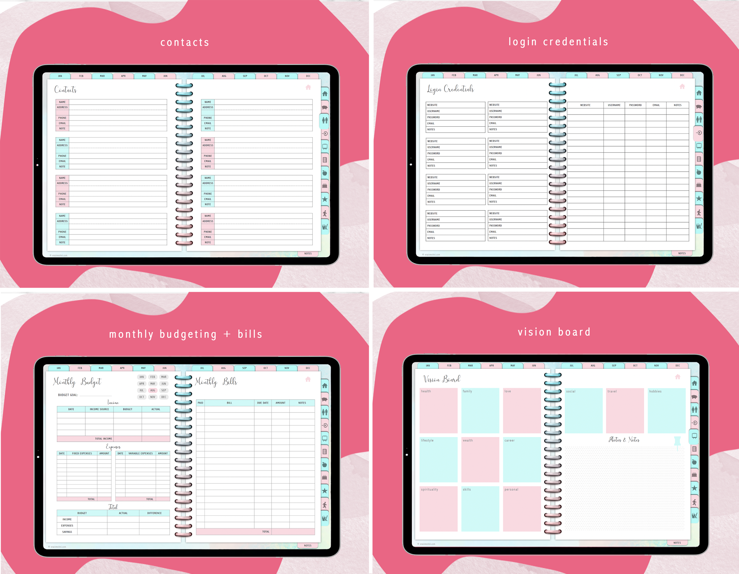 – MONTHLY BUDGET + BILLS PAGES linked to each month for maintaining your finances