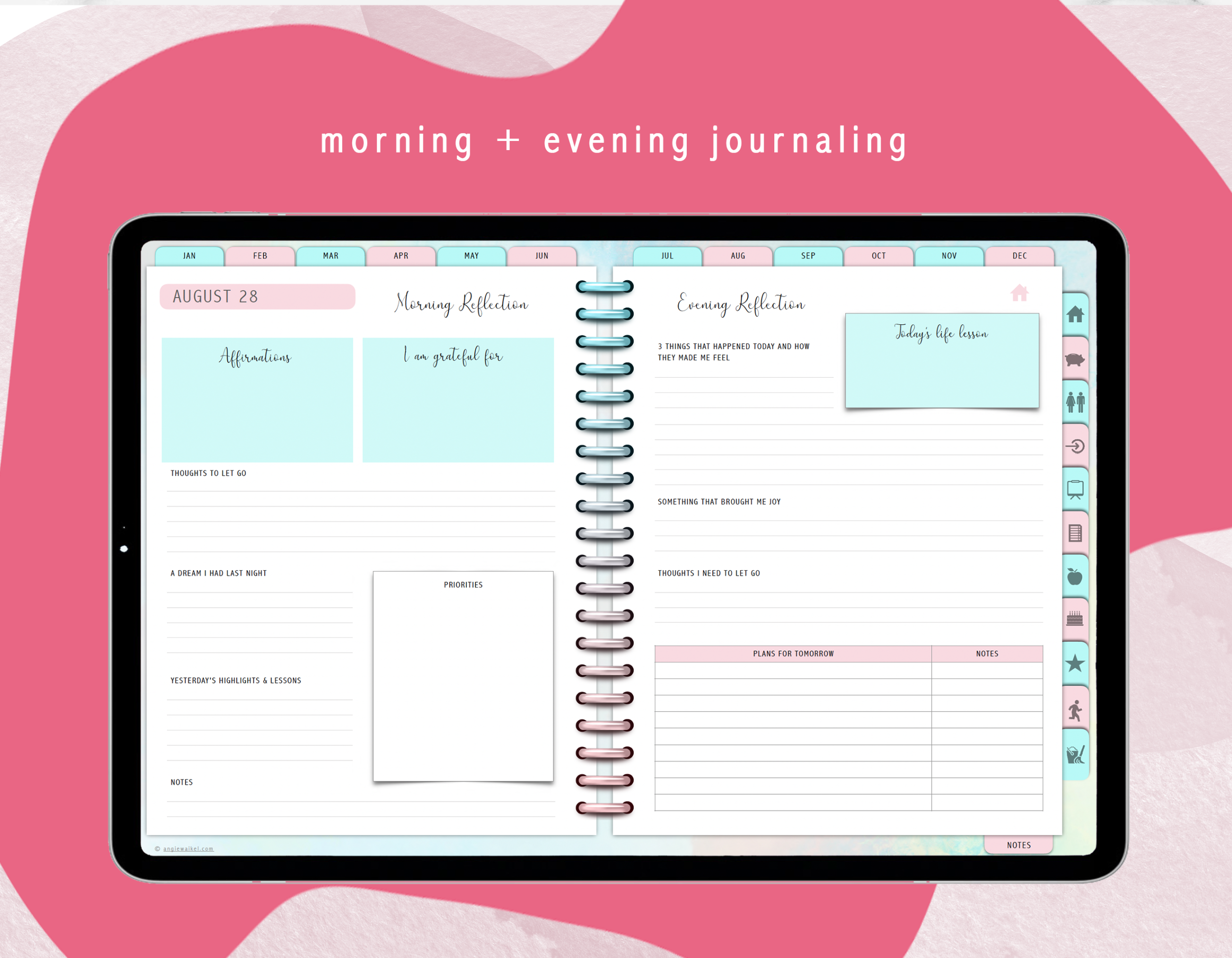 Environmentally friendly digital journals mean no more wasted paper. Digital planners are a sustainable way to plan and organize your days and lifestyle. Customizable, easy to edit, and creatively unlimited to fit your days, weeks, and months.